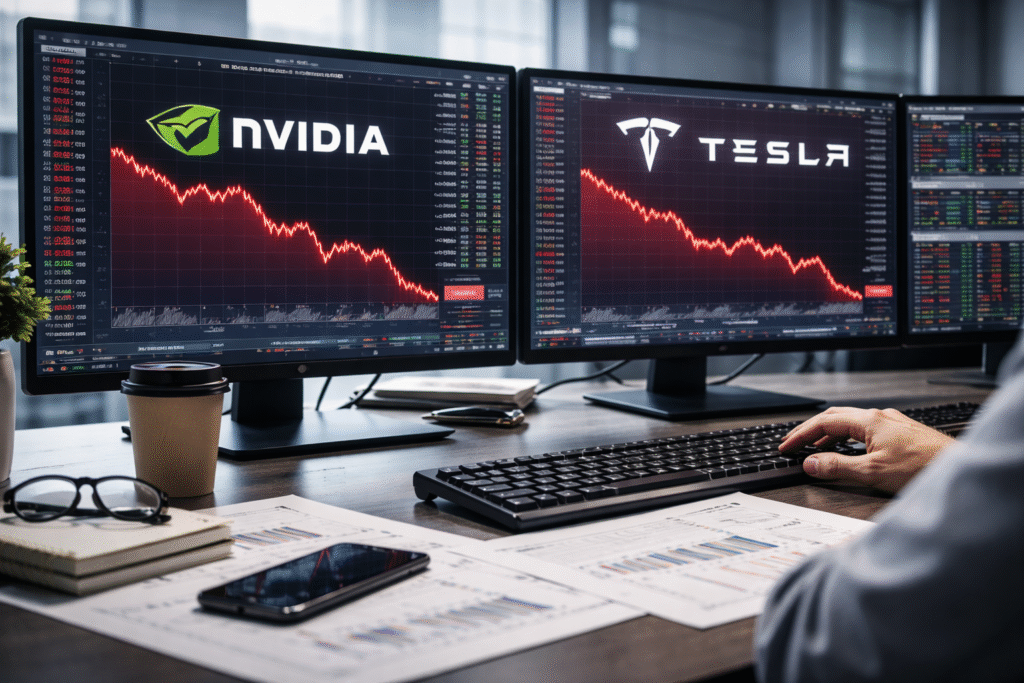 The Nasdaq Composite led losses, falling roughly 0.7%, as shares of Nvidia and Tesla both slid more than 1.5%. The S&P 500 and Dow Jones Industrial Average each dipped about 0.5% as broader market momentum cooled following last week’s holiday rally.
